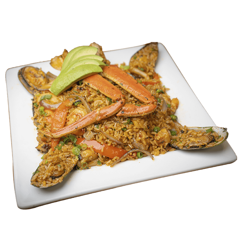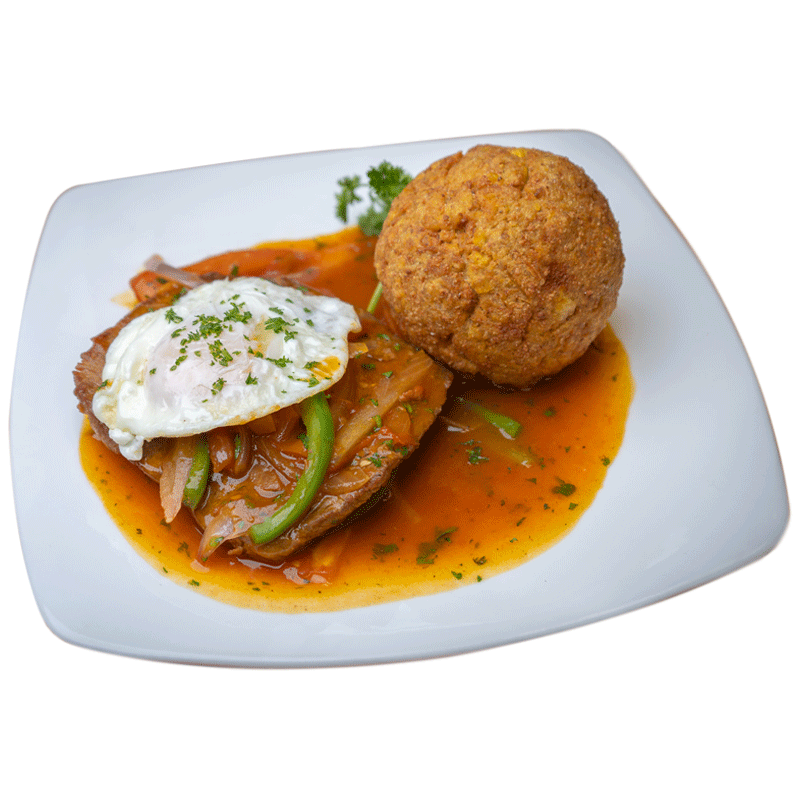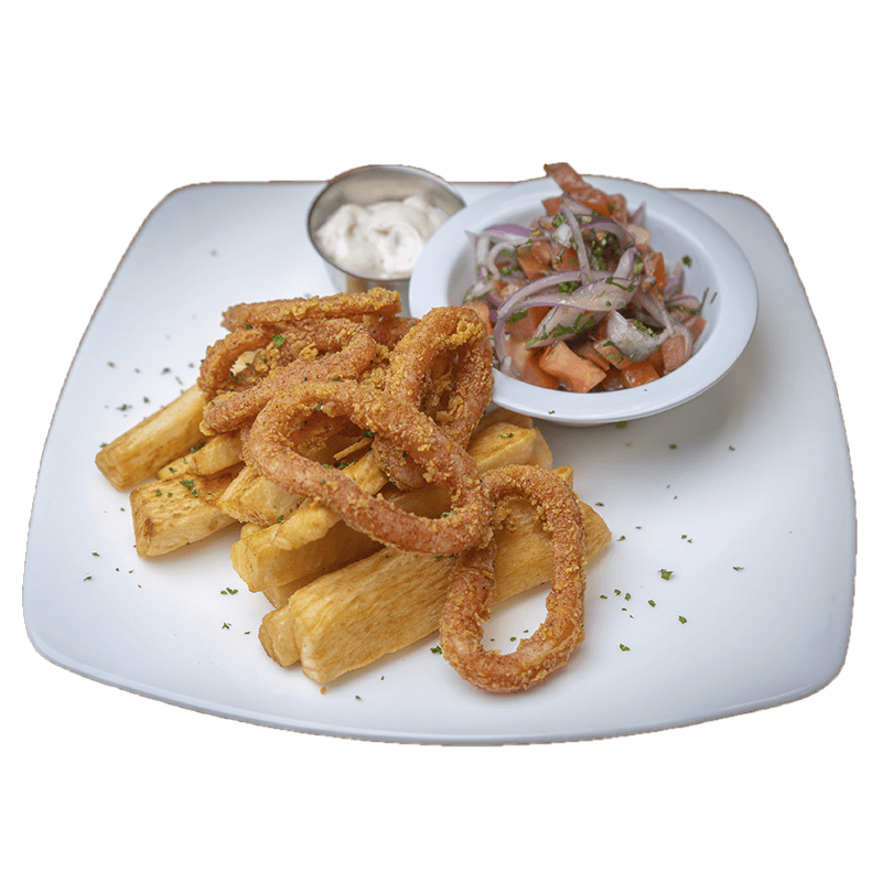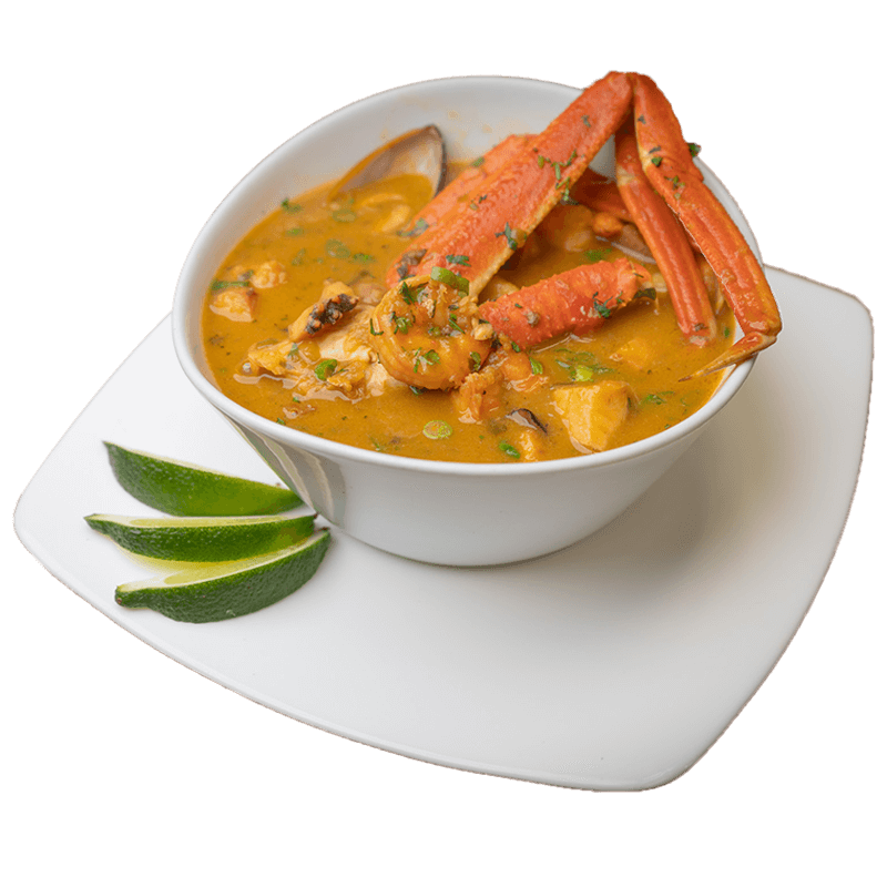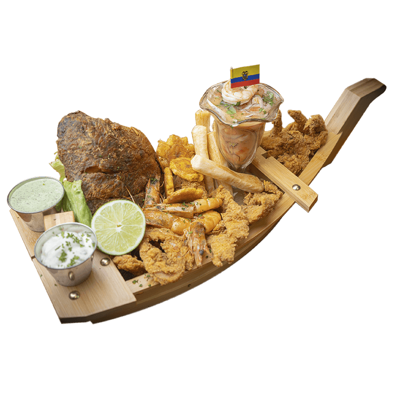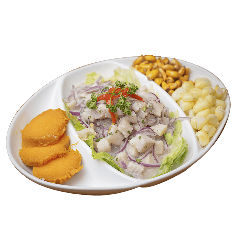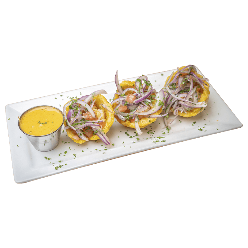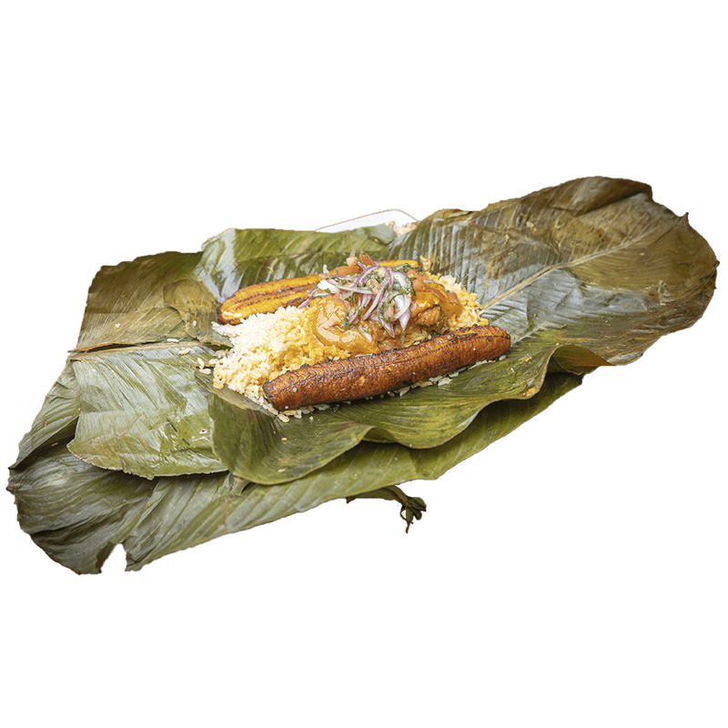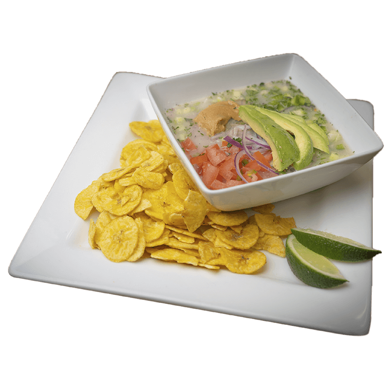 Fresh fish marinated in lime juice with peanut sauce, red onions, green peppers, cucumber, tomatoes, avocado & green plantain.