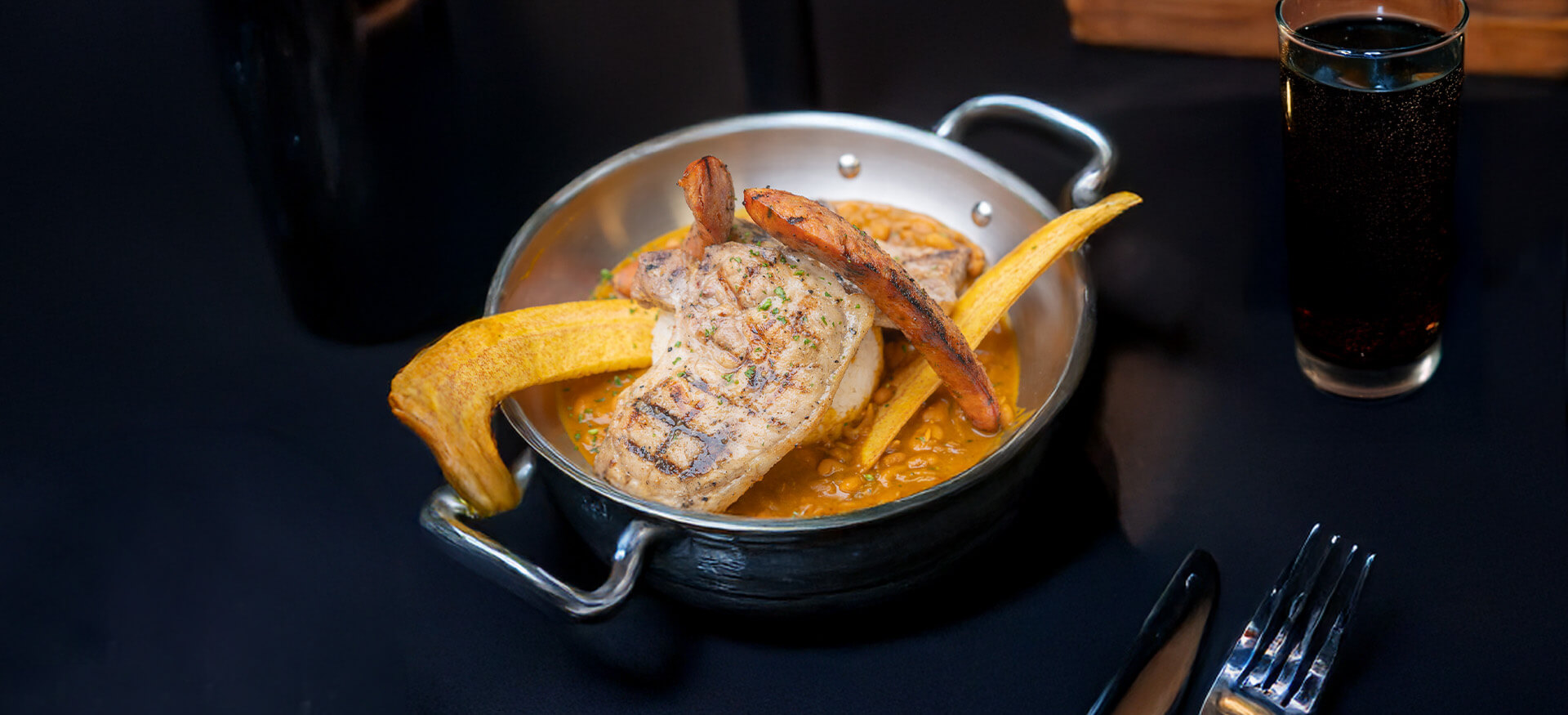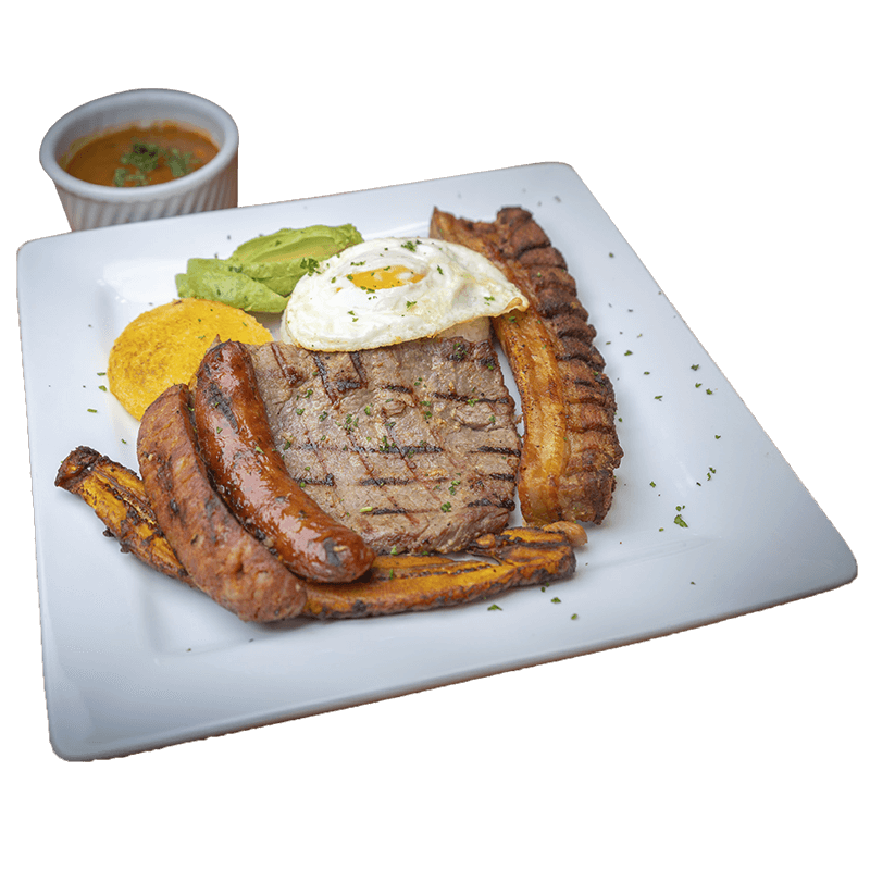 Rice, beans, chorizo, fried plantains, choice of meat: