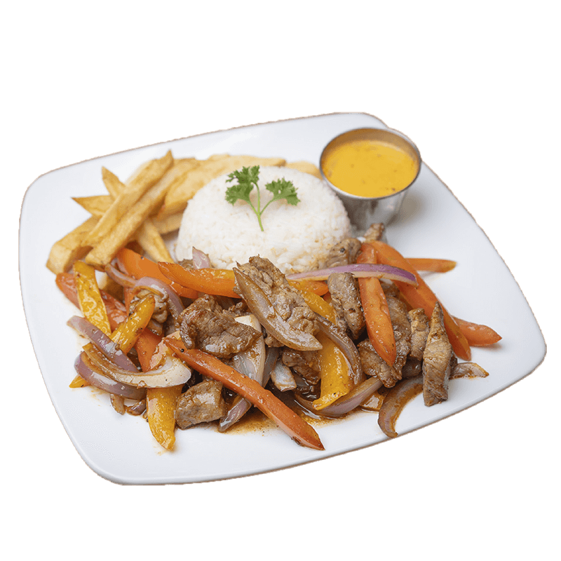 Seasoned rice, stewed beans, cheese sauce, sweet plantains, and choice of meat: