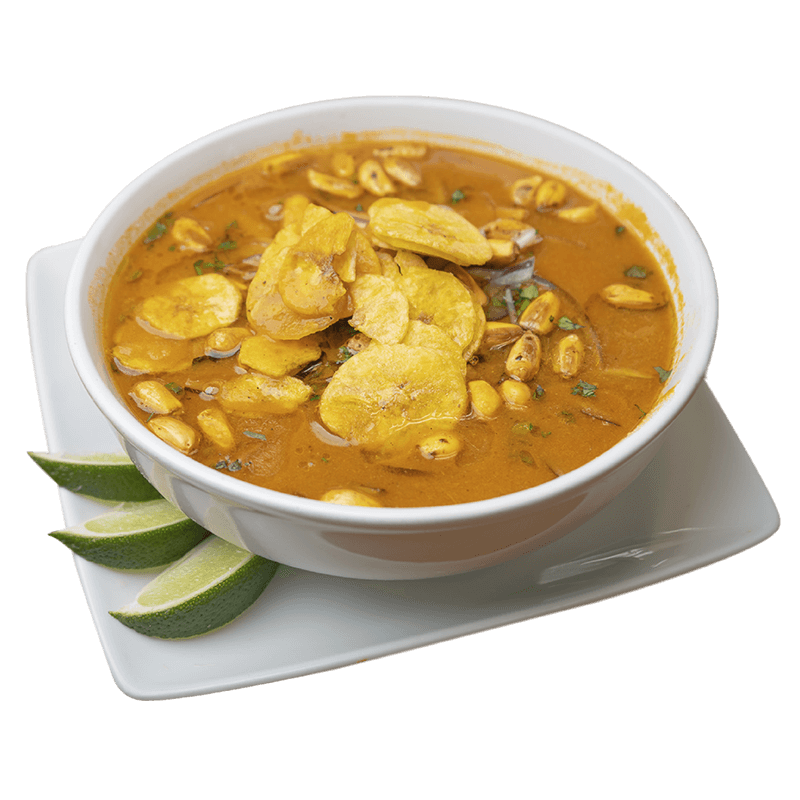 Green plantain dumpling soup with meat & vegetables in peanut broth with corn & yuca
